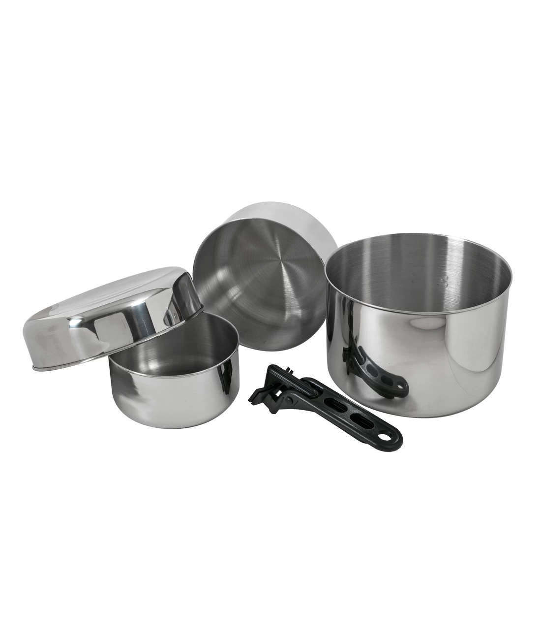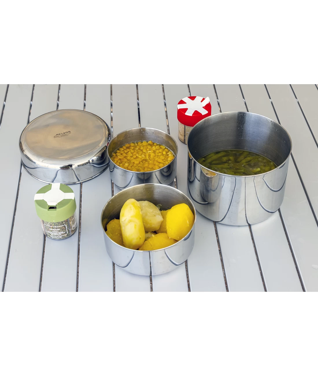 Das große Set für Familien, Gruppen oder die größere Outdoorküche. Parallel zum Biwak Alu 3 wurde dieses Set entwickelt, um auch in Edelstahl etwas mehr Volumen anbieten zu können. Ausreichend für 4 Personen.