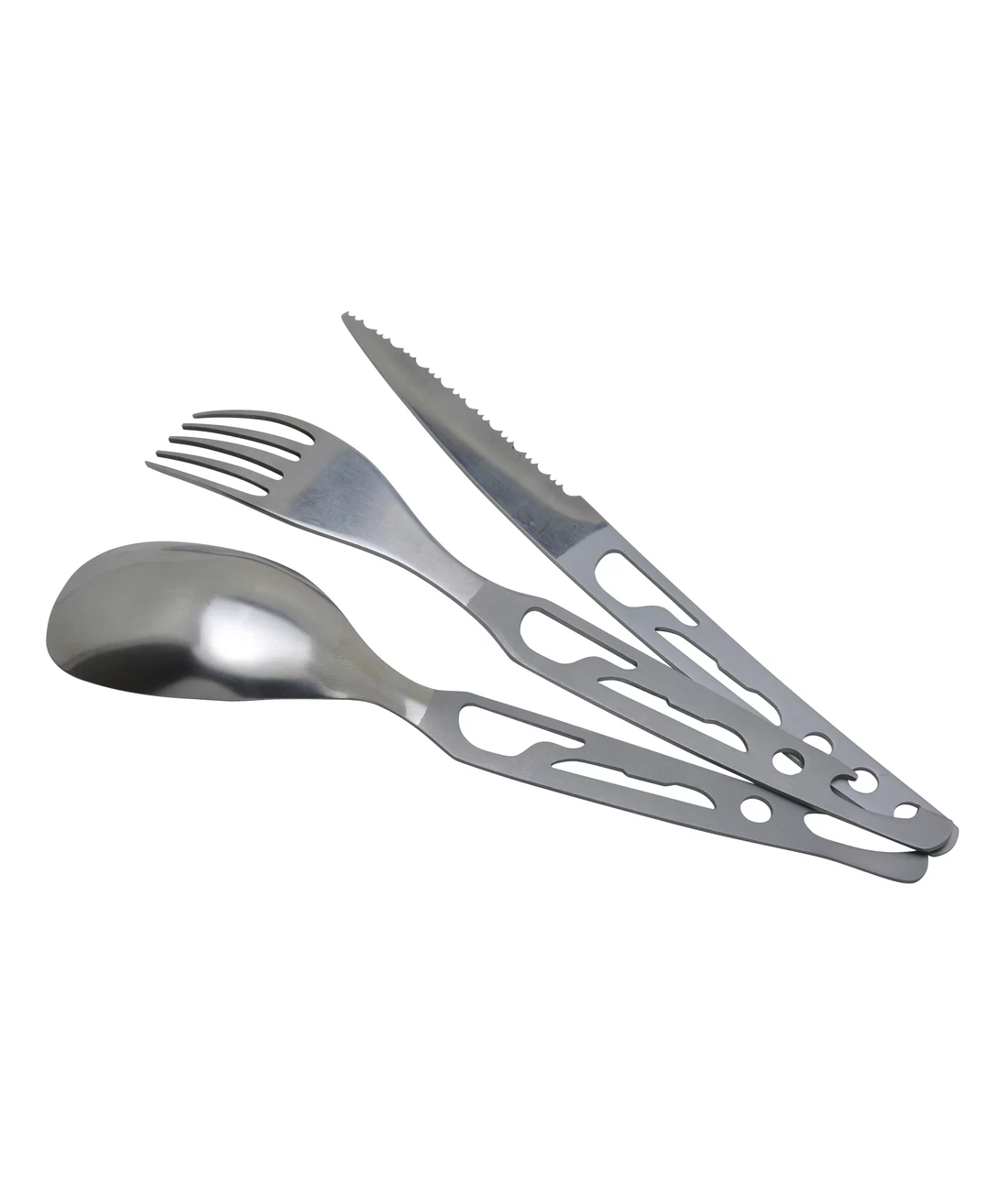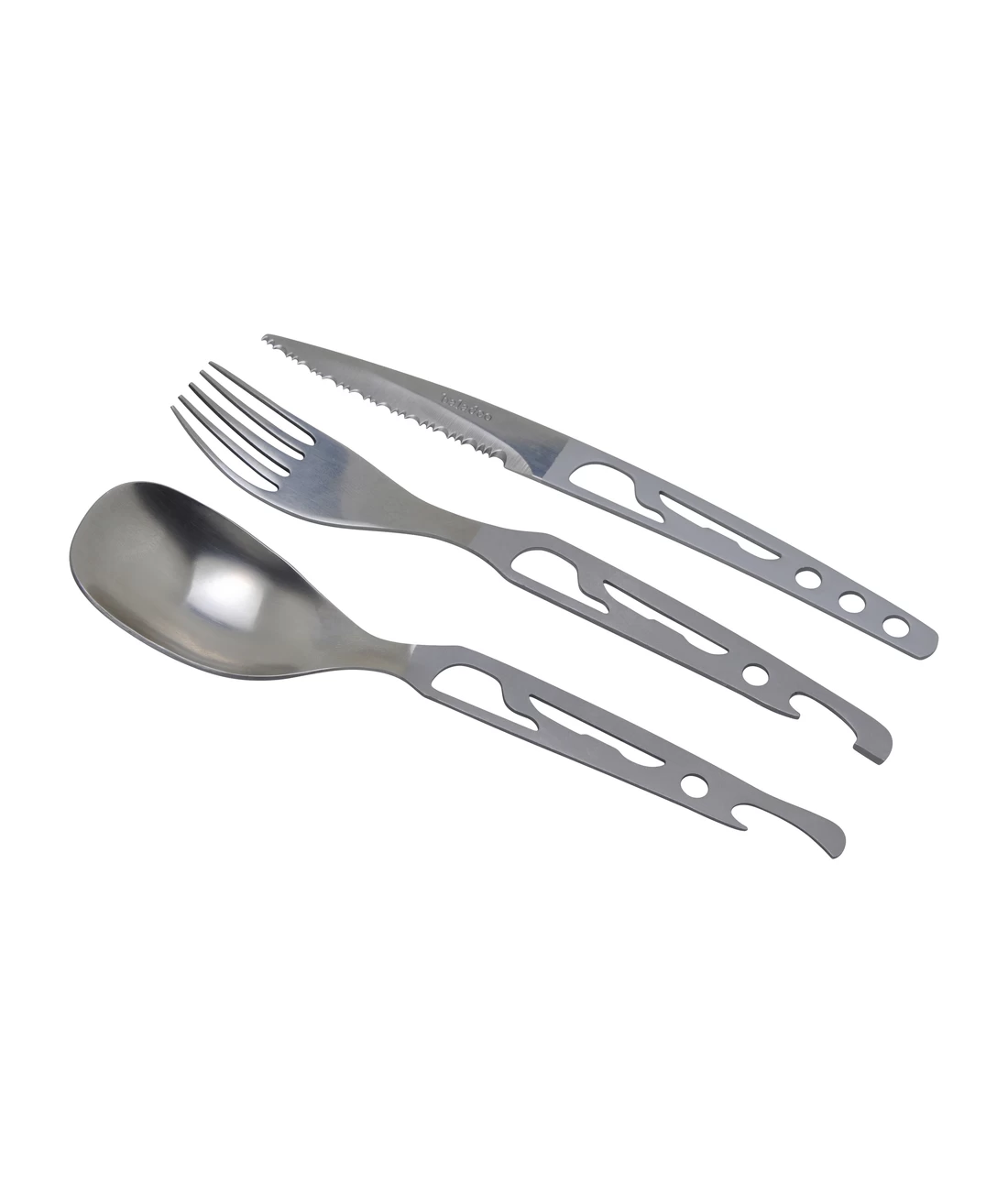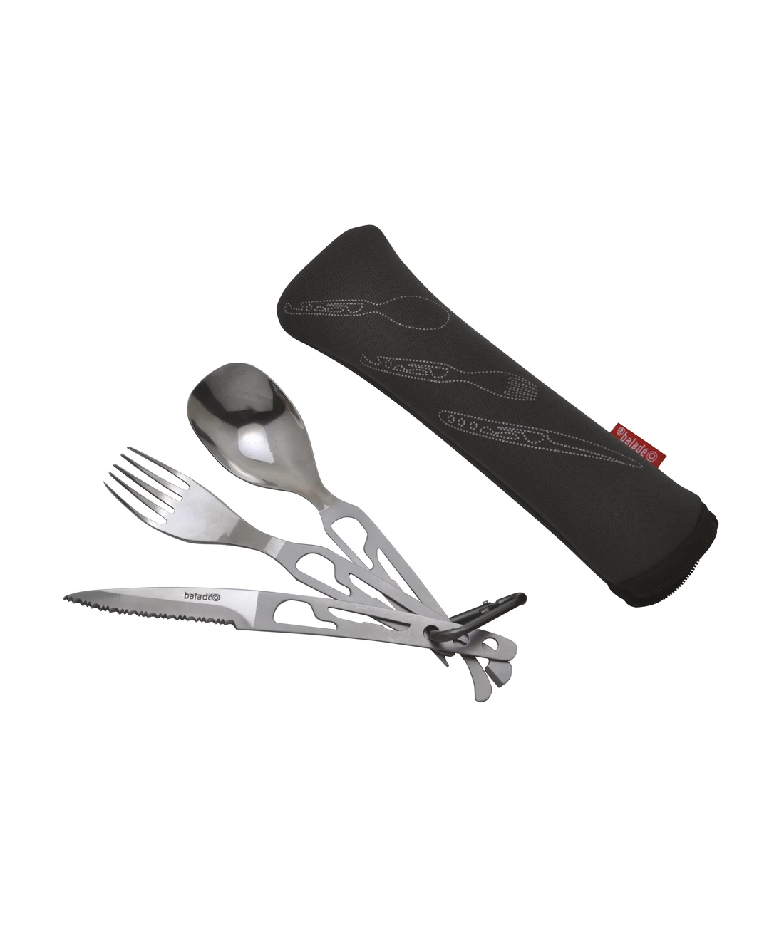 Robust, widerstandsfähig und leicht: Das sind die Qualitäten dieses Reisebestecksets. Geliefert wird es in einer praktischen Neoprenhülle und ist ebenso im Alltag als auch für den Einsatz auf Reisen geeignet. 3-teilig aus Edelstahl gefertigt. Mit fünf Funktionen: Messer, Löffel, Gabel, Dosenöffner und Flaschenöffner. Lieferung mit Karabinerhaken aus Aluminium.