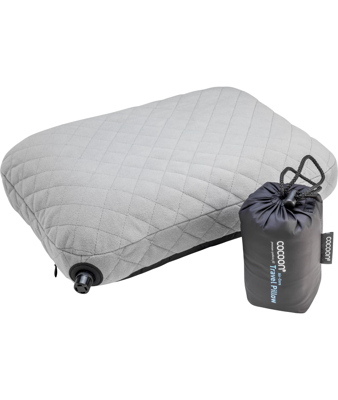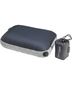 Leichtes, kompakt verpackbares Reisekissen mit aufblasbarem, austauschbarem Luftkern, synthetischer Füllung und einer Hülle aus Mikrofaser und Nylon.