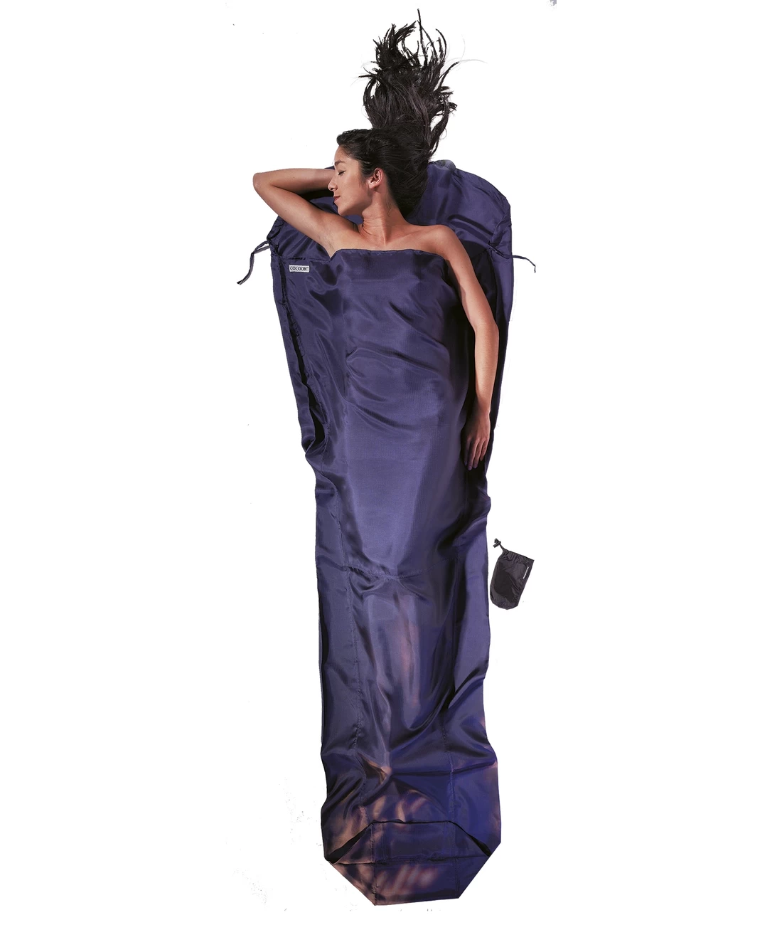 Extrem leichter, mumienförmiger Innenschlafsack zum Schutz des Schlafsackes vor Verschmutzung und zur Erhöhung seiner Wärmeleistung