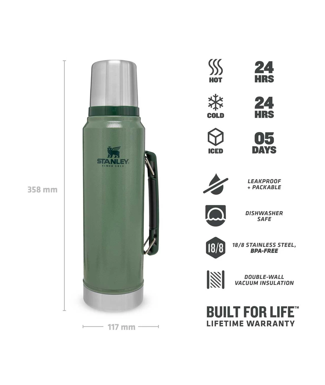 Die aus rostfreiem 18/8 Edelstahl gefertigte Stanley CLASSIC VAKUUMFLASCHE ist mit einer schützenden, grünen Hammerschlaglackierung versehen. Die doppelwandige Vakuum-Isolation hält Getränke bis zu 24 Stunden heiß oder kalt. Der seitlich montierte Kunststofftragegriff sorgt für den problemlosen Transport der Flasche. Über dem Flaschenverschluss sitzt ein Trinkbecher, der ebenfalls isolierend ausgelegt ist. Durch die 5 cm weite Öffnung lässt sich die Flasche sehr gut reinigen.