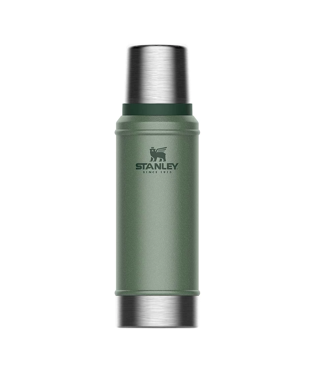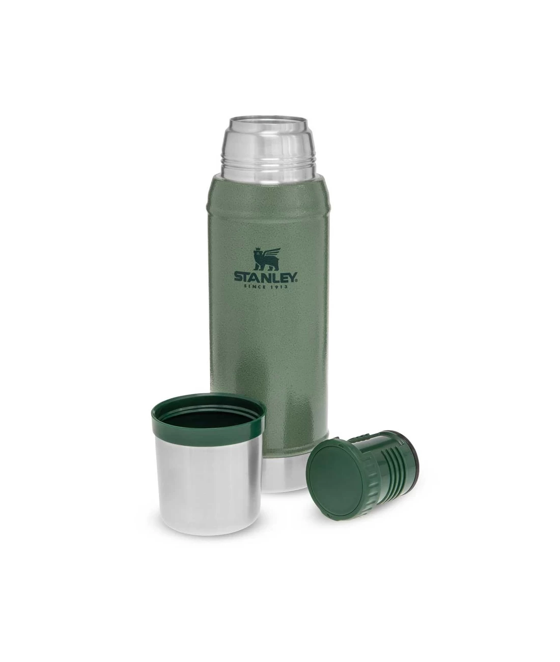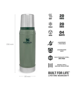 Die aus rostfreiem 18/8 Edelstahl gefertigte Stanley CLASSIC VAKUUMFLASCHE ist mit einer schützenden, grünen Hammerschlaglackierung versehen. Die doppelwandige Vakuum-Isolation hält Getränke bis zu 20 Stunden heiß oder kalt. Über dem Flaschenverschluss sitzt ein Trinkbecher, der ebenfalls isolierend ausgelegt ist. Durch die 5 cm weite Öffnung lässt sich die Flasche sehr gut reinigen. BPA-frei!