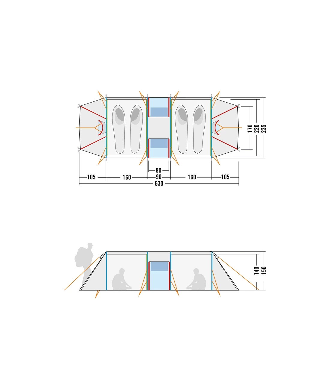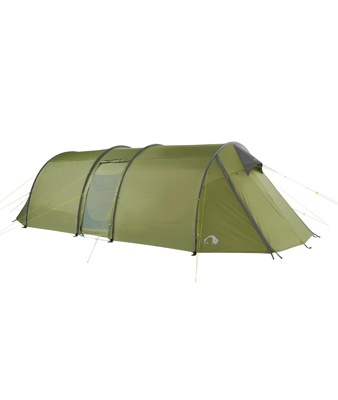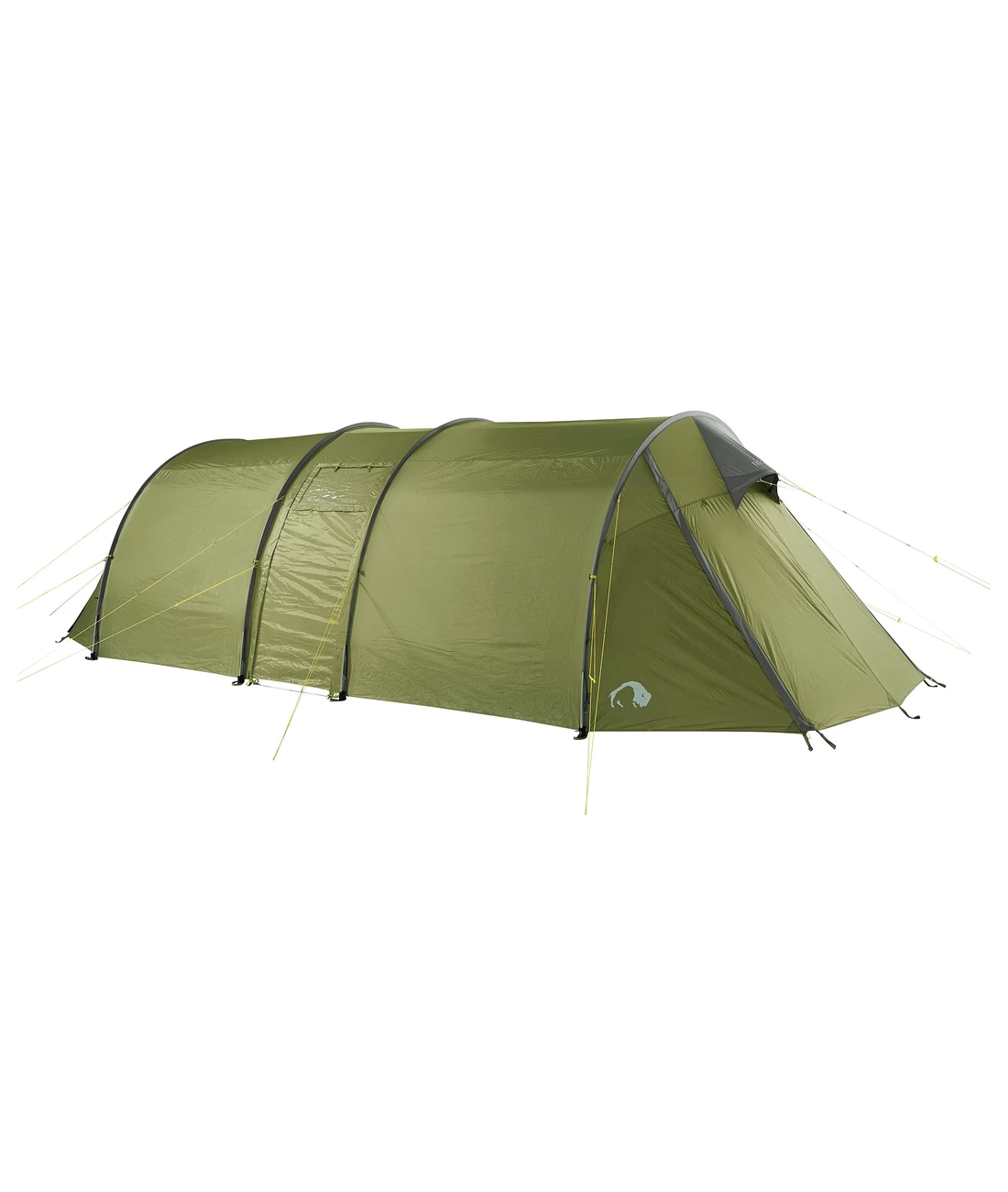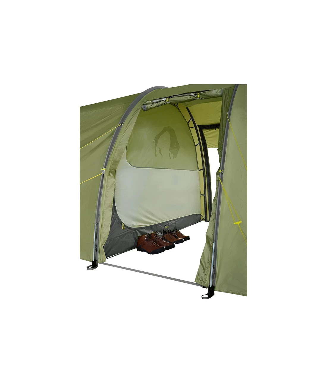 - Tunnelzelt mit vier Gestängebögen, zwei getrennten Schlafkabinen und zentraler Apsis