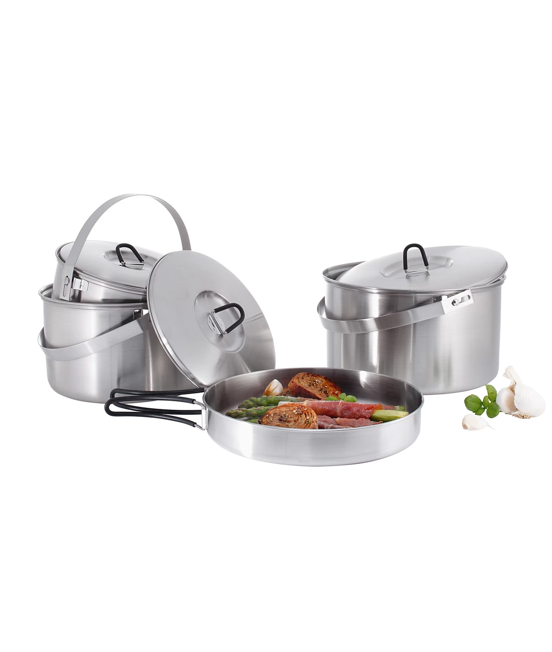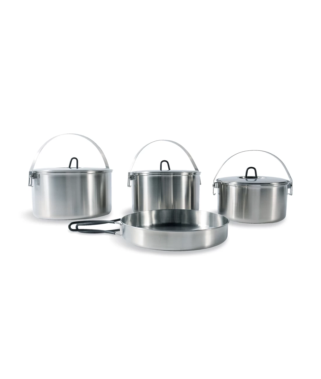 Das Kochset für größere Einsätze mit praktischer Volumenskalierung auf der Innenseite der Töpfe. Bestehend aus drei Töpfen und einer Pfanne, natürlich aus hochwertigem, geschmacksneutralem Edelstahl. Um alle Teile sicher beisammen zu halten, wird das Set im schonenden Transportbeutel geliefert.