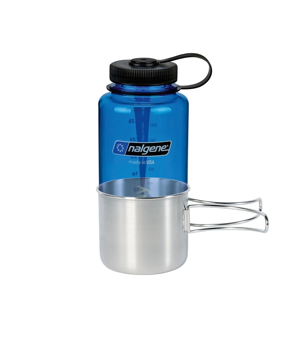 Der Edelstahlbecher Handle Mug mit 500 ml Fassungsvermögen hat praktische Klappgriffe und eine Volumenskalierung innen. Er erfreut sich bei Pack-Experten großer Beliebtheit, da er die klassische, amerikanische Nalgene-Flasche (1 Liter) passgenau umschließt.