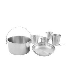 Set für sehr Sparsame. Mit Volumenskalierung im Topf und in den Bechern. Ein Topf mit Deckel, zwei Becher ohne Henkel, ein Becher mit Klappgriff und Deckel – verpackt im praktischen, waschbaren Netzbeutel.
