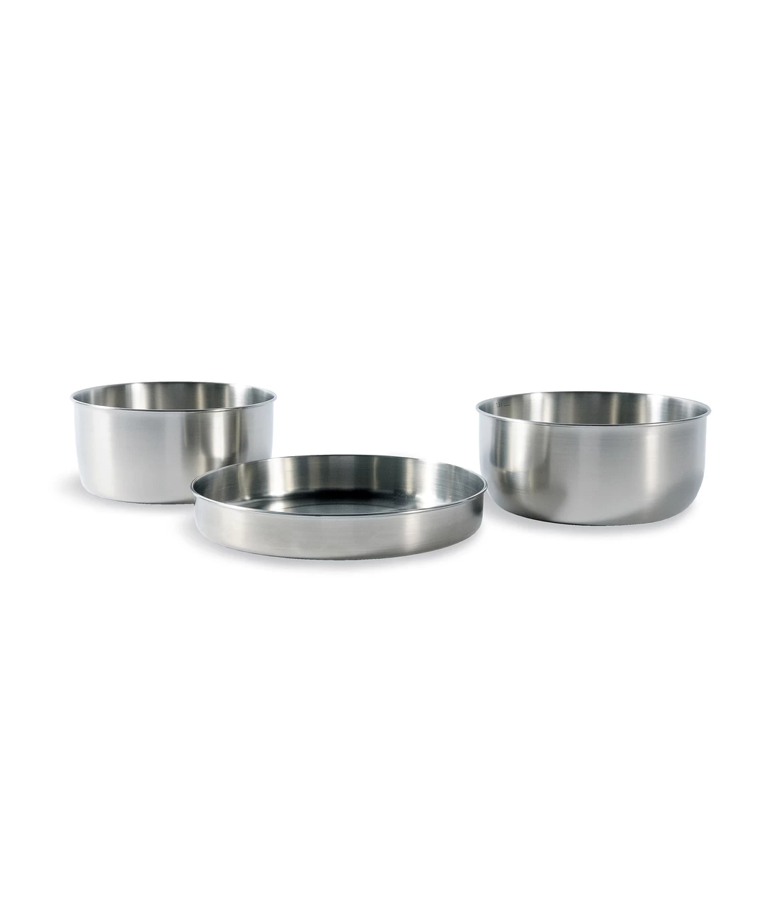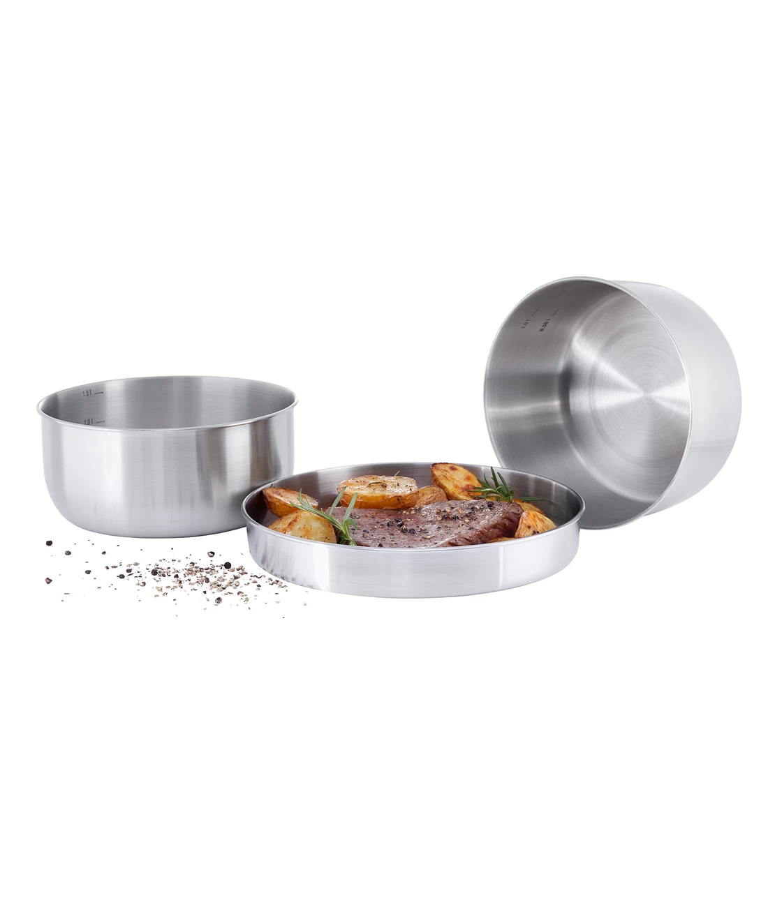 Dreiteiliges Kochset als Grundausstattung für die Outdoorküche. Bestehend aus zwei Töpfen mit Volumenskalierung innen (1,4 und 1,6 Liter) und einer Pfanne, die auch als Topfdeckel oder Teller fungiert.