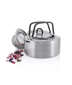 Teekessel mit integriertem Sieb. Der Teapot ist robust verarbeitet und lässt sich dank der kompakten Abmessungen gut im Rucksack transportieren. Das Teesieb aus Edelstahl ist bereits enthalten.