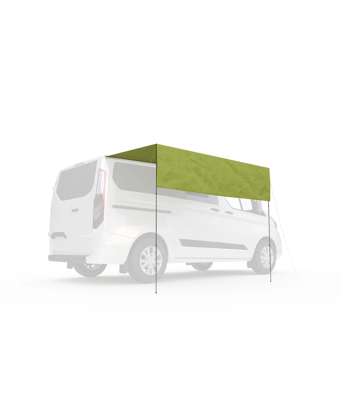 Robustes Vordach mit Kederbefestigung für Busse verschiedener Marken. Gefertigt aus wasserdicht beschichtetem Polyestergewebe. Das Van Camp Tarp wird in die Kederschiene des Busses eingezogen und mit Tarpstangen aufgestellt.